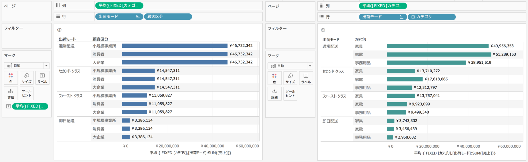 どういうことでしょうか。例として、AVG({FIXED [カテゴリ],[出荷モード]: SUM([売上])})という式を以下の2つのビューに入れてみました。