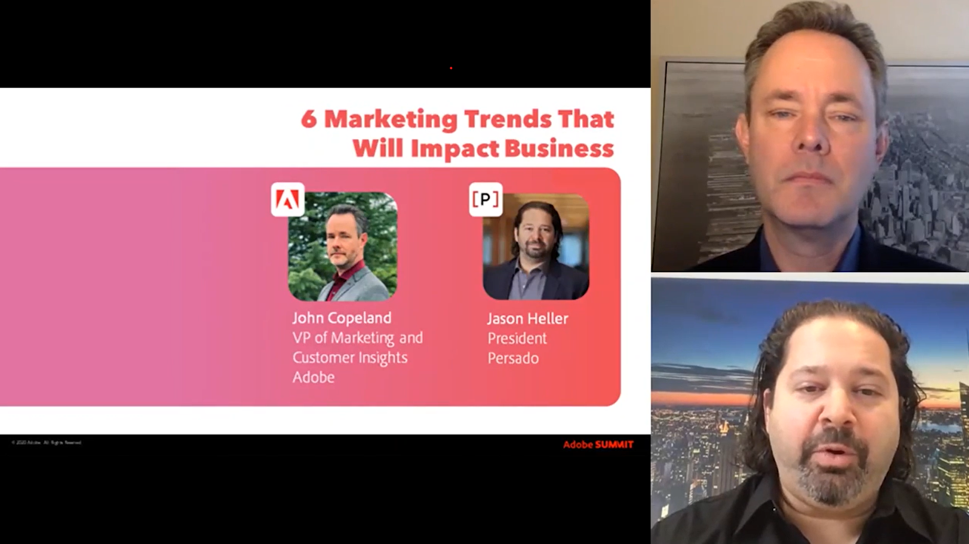 AdobeのVice PresidentであるJohn Copeland氏と、AIによるコピーライティングを提供しているPersado社の社長であるJason Heller氏によるセッションです。