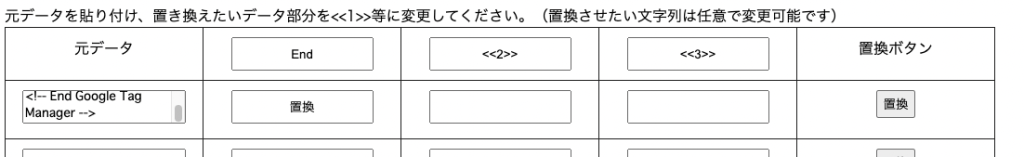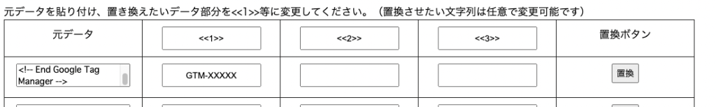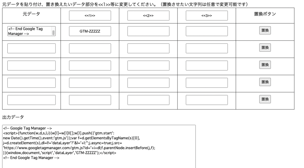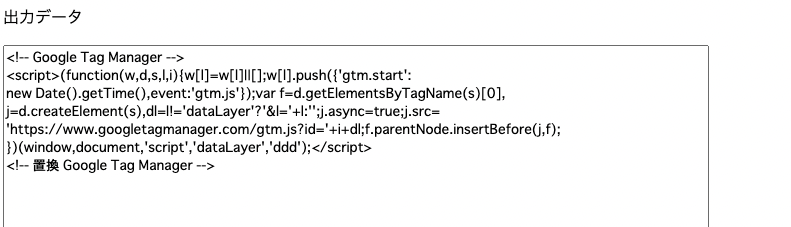 実際に元データ部分に上記コードをコピペし、置換部分にGTM-XXXXXと記述します。