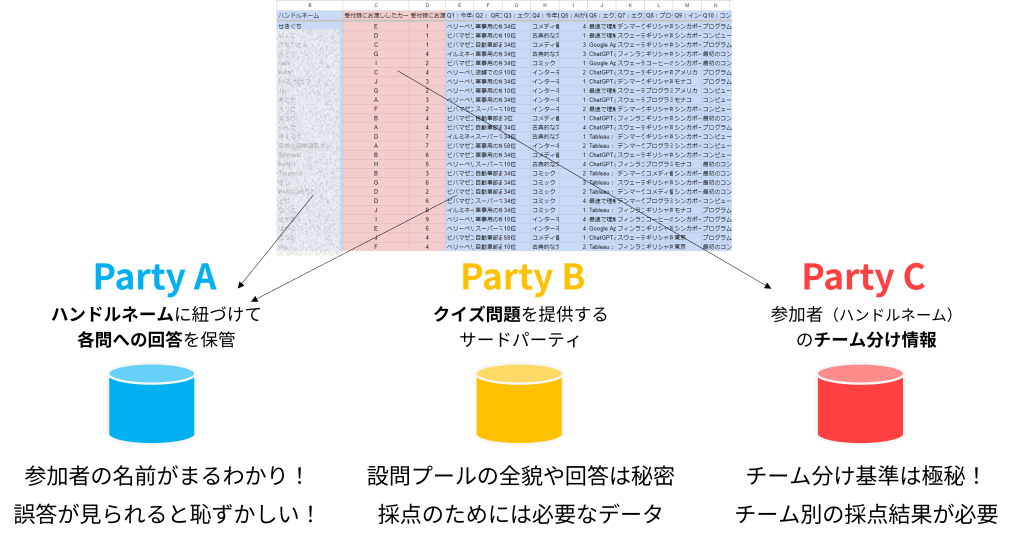 ただし、今回の出題した10問に関しては、正解を明かすか、どうにか採点ロジックを提供しないことには採点ができません。パーティAが集めた回答データには顧客の個人情報(=ハンドルネーム)が含まれており、パーティBにそれを丸ごと預けて採点業務を委託することは難しいです。