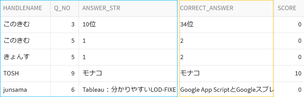 この許可済みの集計クエリによってのみ、くいずやさんのデータを引き出し、採点することができます。