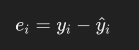 推定される回帰直線で得られたy軸の値と、観測されたデータで得られたy軸の値との差を残差と呼び、以下のように表されることが一般的です。
