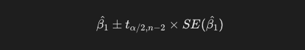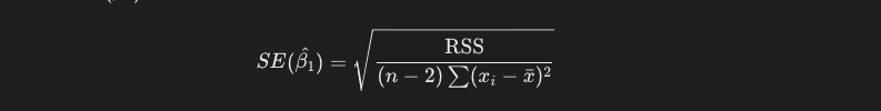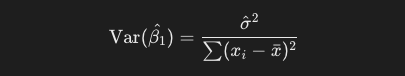 次に、傾きの分散は以下の式で求めることができます。xの偏差平方和を分母にしているのは、回帰係数の推定値の標準誤差を適切に評価するためです。xの散らばりが大きい、つまりデータポイントが広く分布しているデータであるほど、モデルがデータの傾向をより正確に捉えることができます。