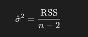 ここで、回帰直線の切片と傾きという2つのパラメータが決まるので、残差の自由度はデータ数から2を引いたものになります。残差平方和を自由度で割ると、誤差項の分散の不偏推定量が得られます。