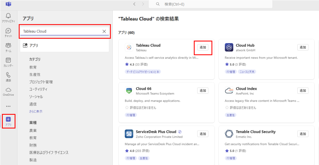 Teamsを開き、左下のアプリから「Tableau Cloud」を検索し、アプリを追加します。