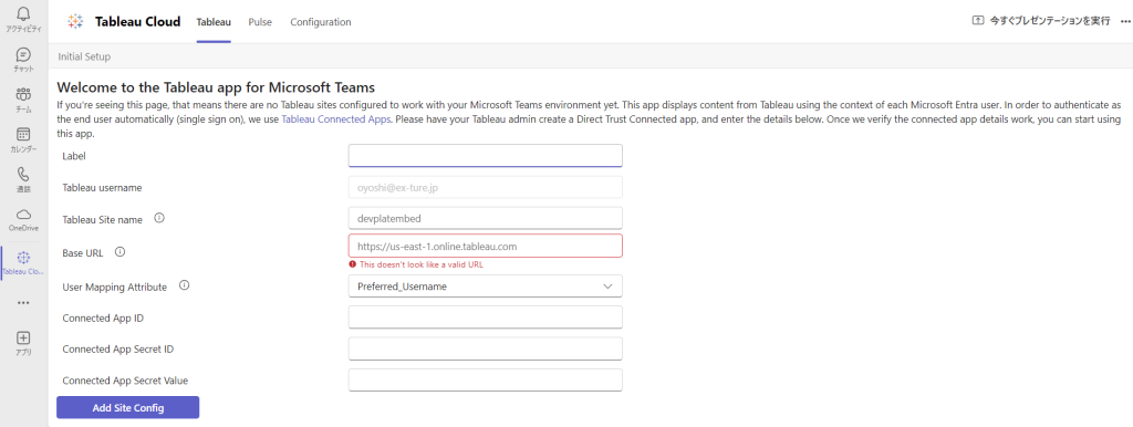 左下のAdd Site Configをクリックし、Tableauの世界をTeamsと連携させましょう!