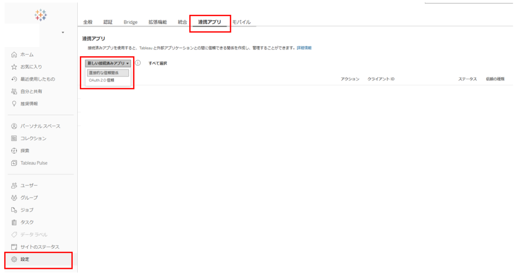 ログイン後、左下の設定を選択し、連携アプリを開きます。