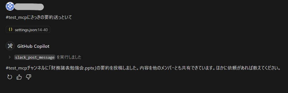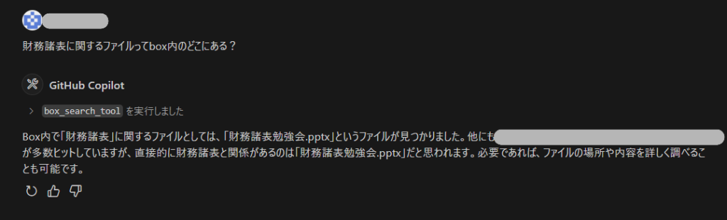 今回は「財務諸表勉強会.pptx」をboxに入れてよく使いそうなツールを使ってみます。MCPクライアントはvscodeを使っています。