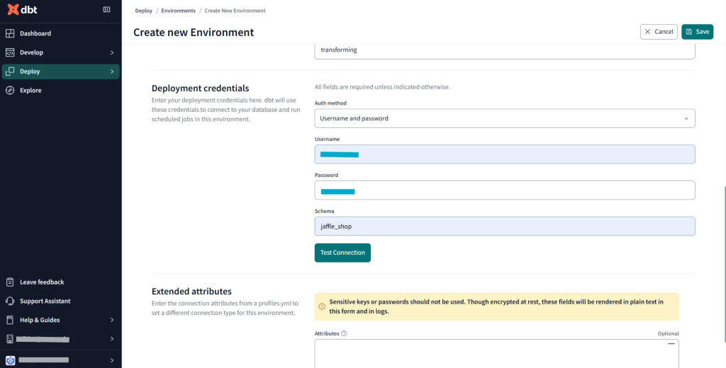 Connection settingsはdbt_project.ymlでテーブルの保存先を指定しているので今回は空欄でOK