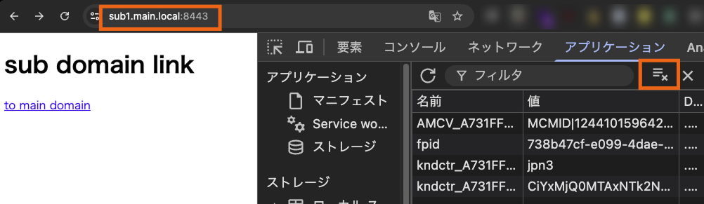 遷移元のsub1.main.local(サブドメイン)で一旦クッキーを全削除します