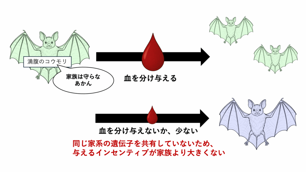 ナミチスイコウモリでは、餌を取れなかった仲間に餌を分け与える現象が知られています。このような行動は利他行動として知られています。