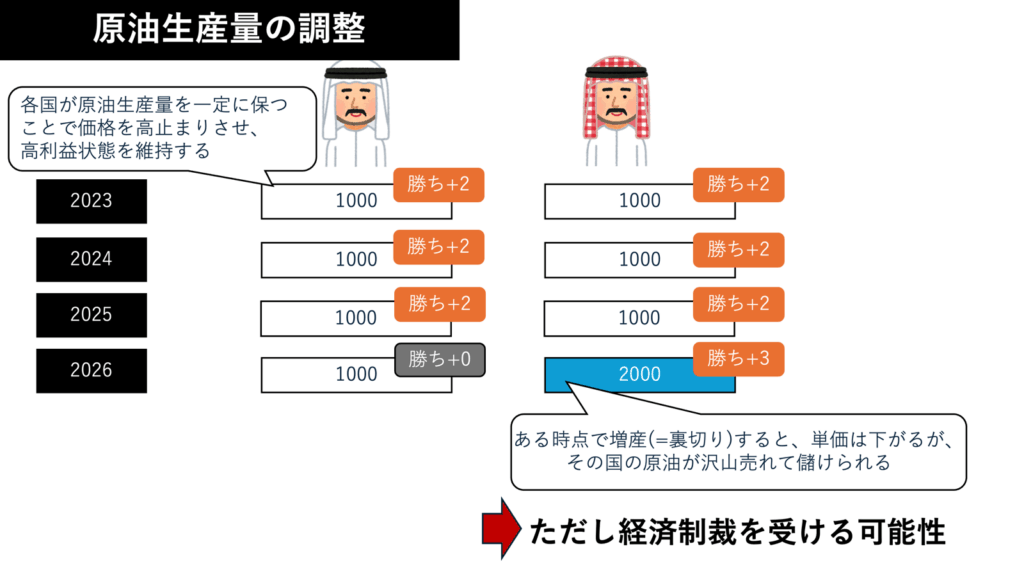 繰り返しゲームでは裏切りが次回以降の協力を失わせるペナルティになります。