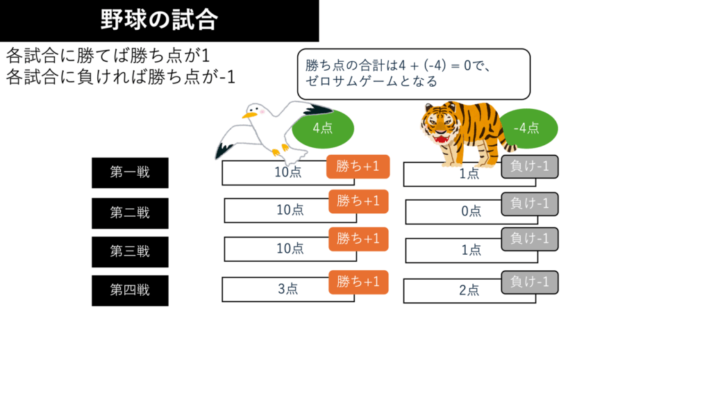 - ゼロサム・ゲーム: 誰かの利益は必ず他者の損失になるゲームで、全体の得点合計は0となります。