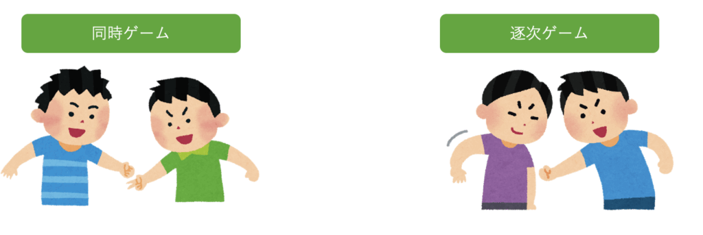 - 同時ゲーム: 各プレイヤーは同時に選択を行い、相手が何を選択したかは自分の選択を明らかにするまでわかりません。