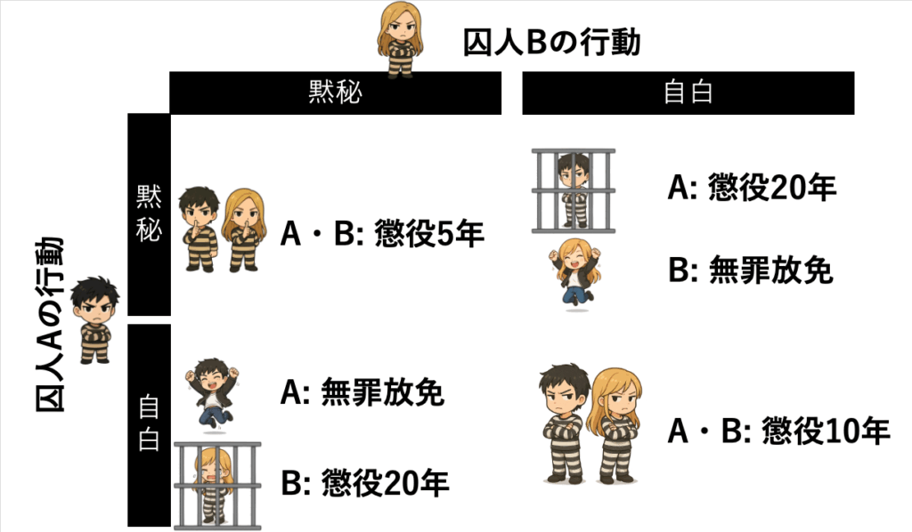 - 片方が自白(裏切り)、もう片方が黙秘(協力): 自白した側は無罪、黙秘した側は最も重い刑