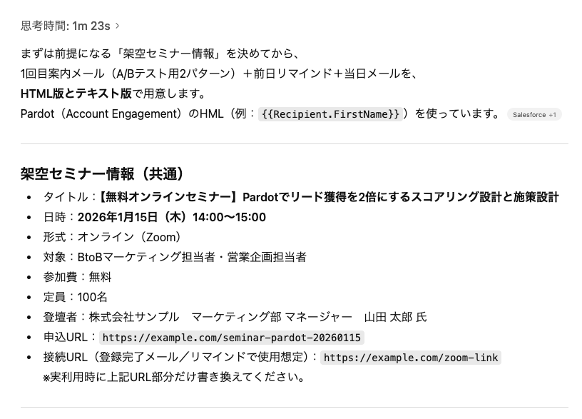 これだけでも結構熟考した感じのメールが出来上がるのでおすすめです。所要時間はAccount Engagementの設定を含めても全部で1時間くらいでしょうか・・・