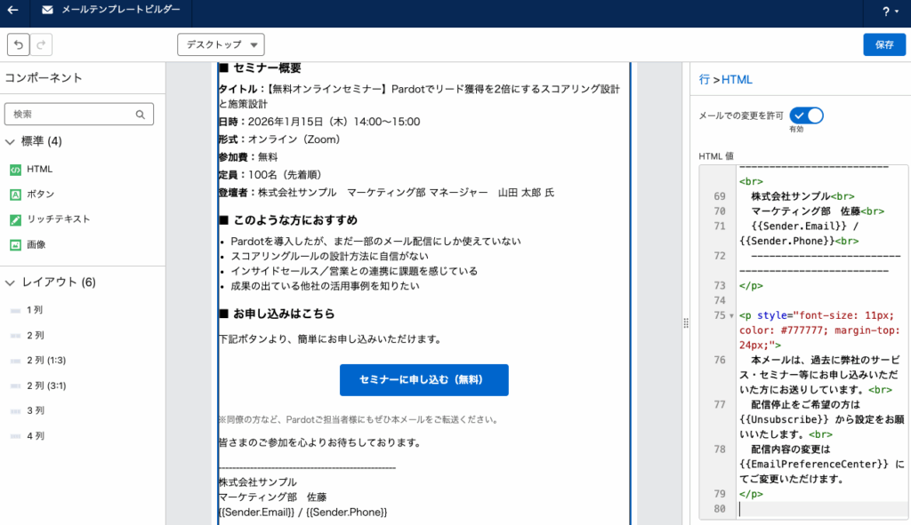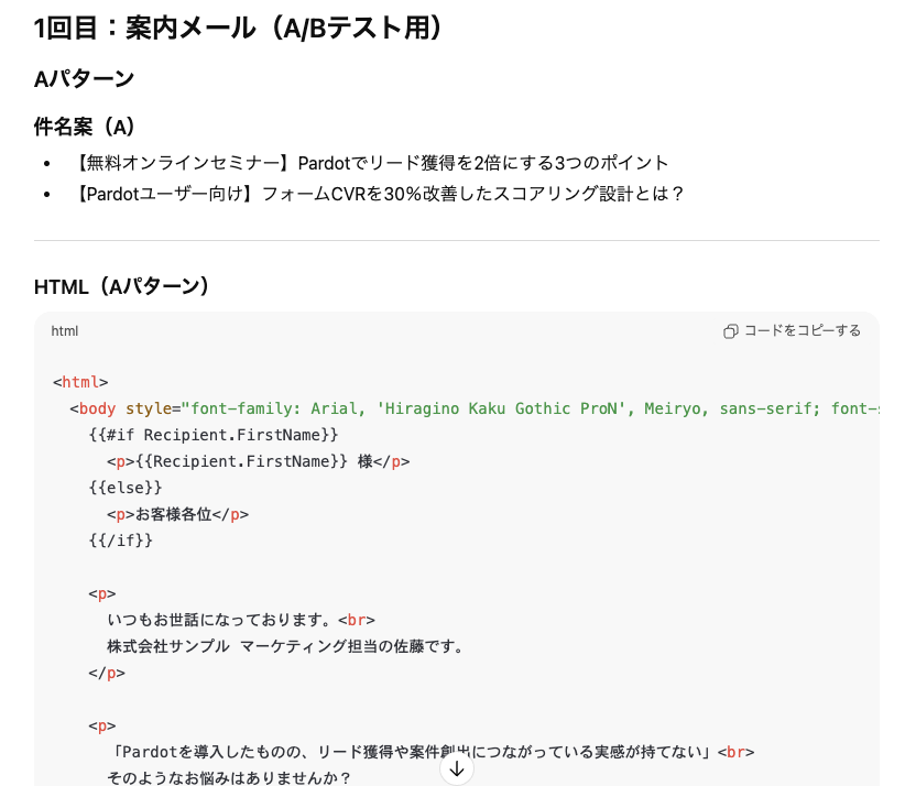 PardotはAccount Engagementの旧名称ですが、こっちの方が生成AIさんはよく理解してくれる気がする(経験上)のであえてつかっています。ここで出てきたHTMLをAccount Engagementでのメールテンプレートビルダーの中でHTMLのコンポーネントにコピペするとこんな感じになります。