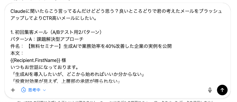 私が実際にやっている方法としては、まず一番リーダーとなる仕切り役をどの生成AIにするか(例:ChatGPT)にして、考える用の生成AI(例:Claude、Gemini)を定義します。まずはChatGPTに要件を伝えて案を考えさせ、同じリクエストをClaudeとGeminiに行って案を出させたうえでそれぞれChatGPTに食わせてブラッシュアップをさせます。