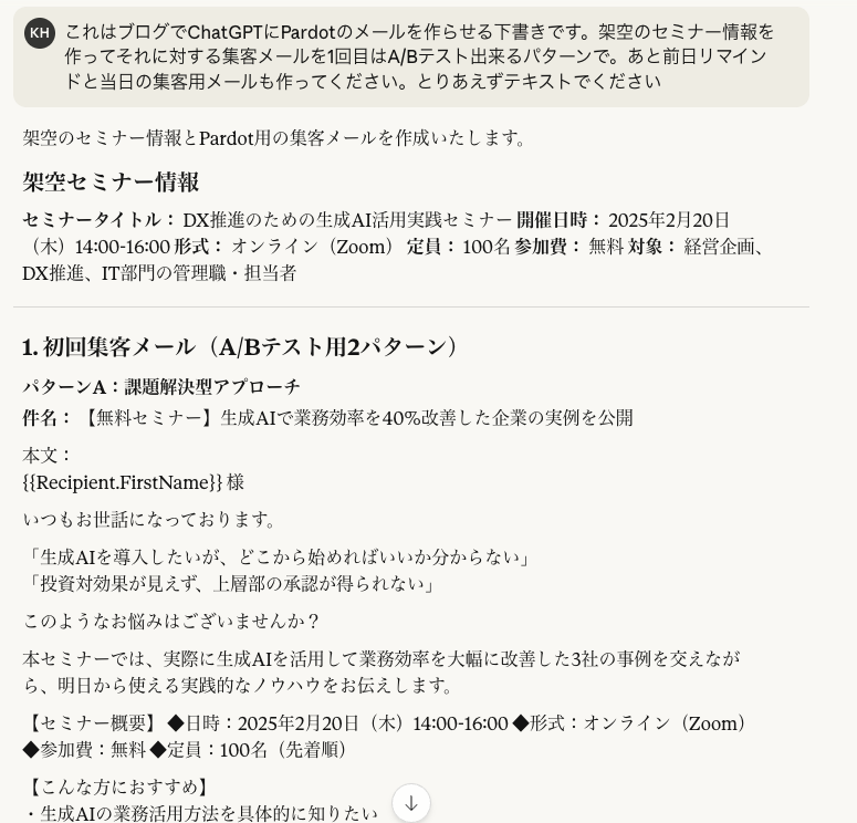 「◯月◯日にセミナーを開催します。企画書添付します。以下のLPに集客します。 https://〜〜〜 LPの文章を全部コピペでも送ります。CTRを重視して一般的なベストプラクティスに即した形で集客メールを作ってください。Pardotにそのまま貼り付け出来るHTMLとテキストをください。」