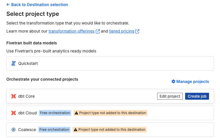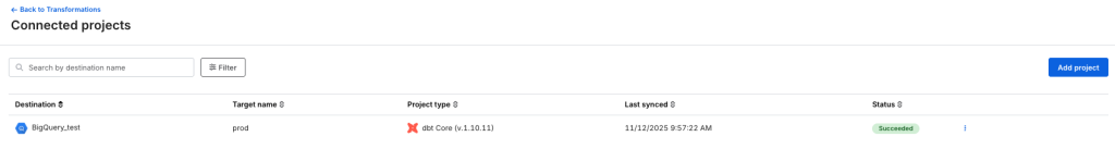 (同じdestinationでも、dbt coreとdbt cloudでは別のプロジェクトになります)