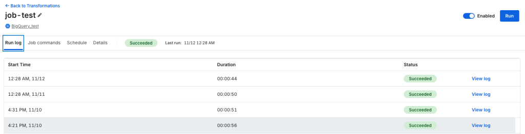 Fivetranがデータソースを最新化、その完了をトリガーにデータ変換を実行する、という連携が自動で行われます。そのため、古いデータを参照して変換してしまうという事故を防ぎ、個別にスケジュールを設定する必要がありません。