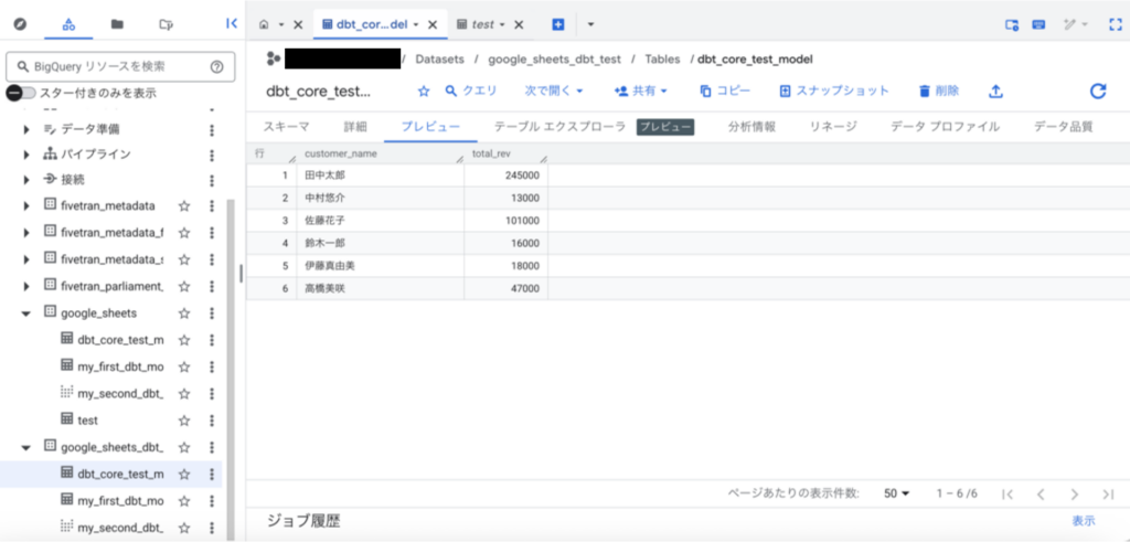 dbt coreで定義した、dbt_core_test_modelテーブルも作成されていることが確認できました。