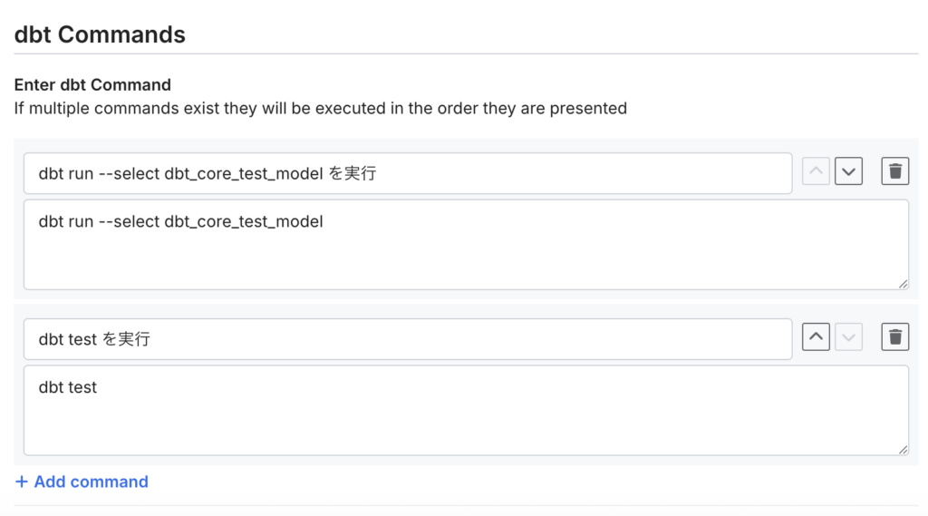 dbt run, dbt test など複数のコマンドを一つのジョブ内に定義できます。