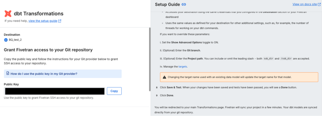 Fivetranがリポジトリを読み取るために、公開鍵をコピーしてGithub側のリポジトリに登録して秘密鍵を発行します。