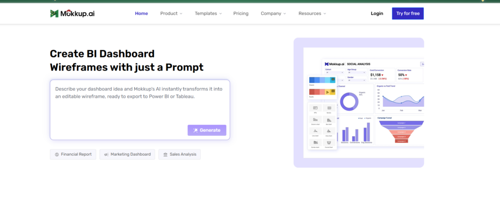 Mokkup は、ダッシュボードやデータ可視化画面のモックを、文章による指示だけで自動生成できるオンラインのワイヤーフレーム作成ツールです。