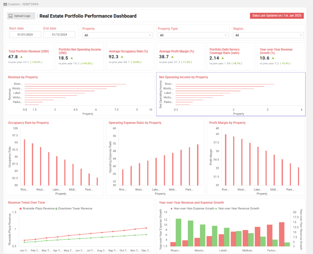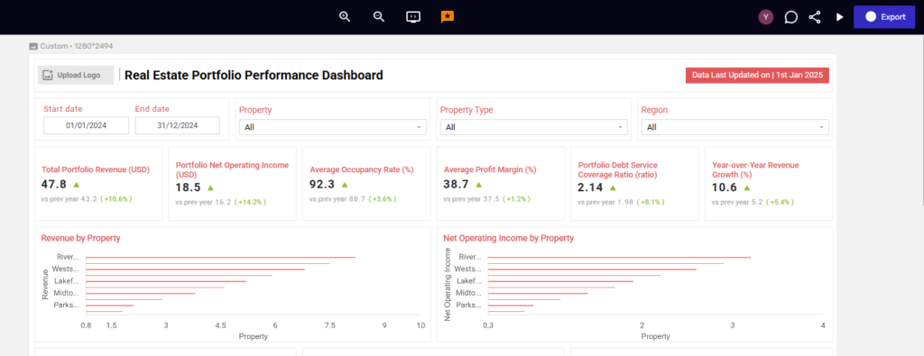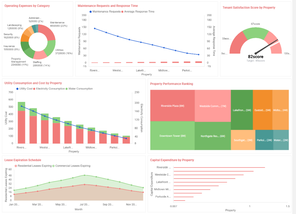 よくある業務ダッシュボードをカバーするテンプレートやチャート・カード・表などが多数揃っており、構成のカスタマイズも柔軟に行えます。