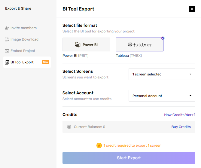 作成したワイヤーフレームを Tableau や Power BI にエクスポートできるため、モックから本番環境への移行がスムーズです。