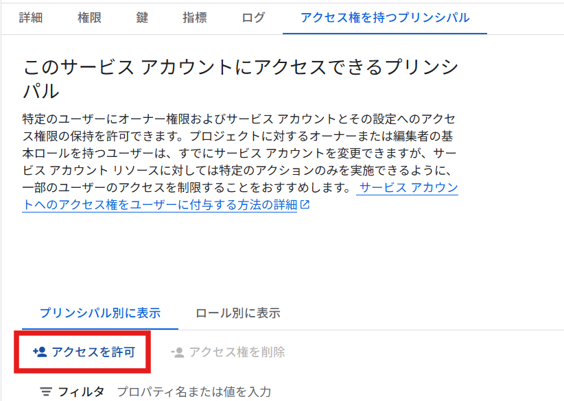 アクセス権を持つプリンシパルで + アクセスを許可 を選択