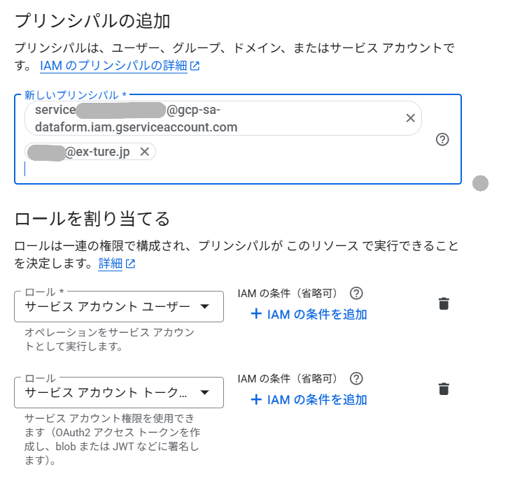 次に作成したサービスアカウントへのアクセス権を許可するユーザーを追加します。