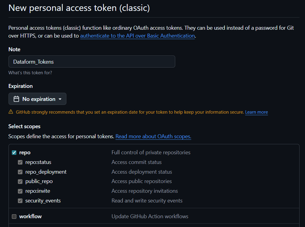 アクセス名に名前を入れ、期限を選択し、スコープをrepoを選ぶ