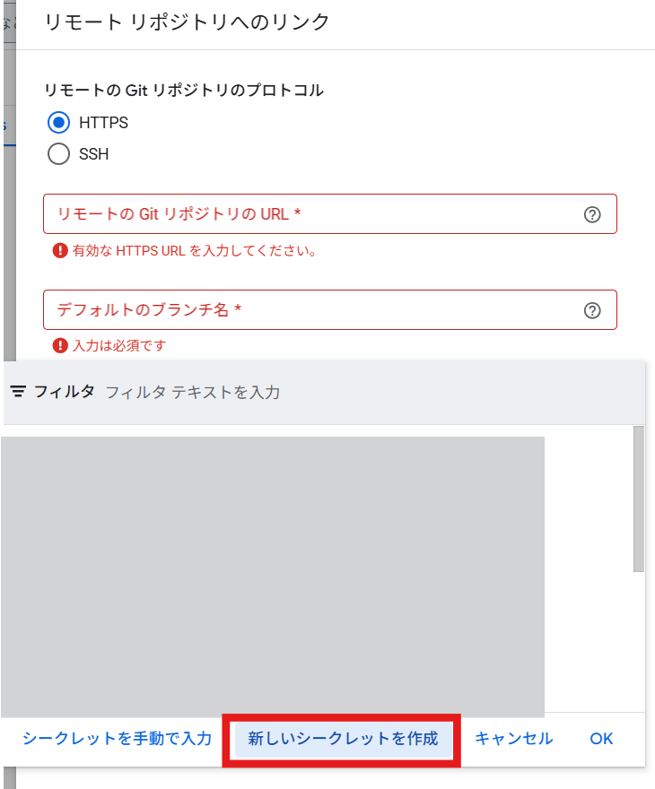 作成が完了したら、Git接続画面で、先ほど作成したシークレットが設定されていることを確認してリンクを選択する。
