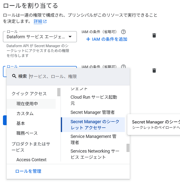 表示されたプリンシパル service-****************@gcp-sa-dataform.iam.gserviceaccount.com にSecretManagerのシークレットアクセッサー権限を付与します。