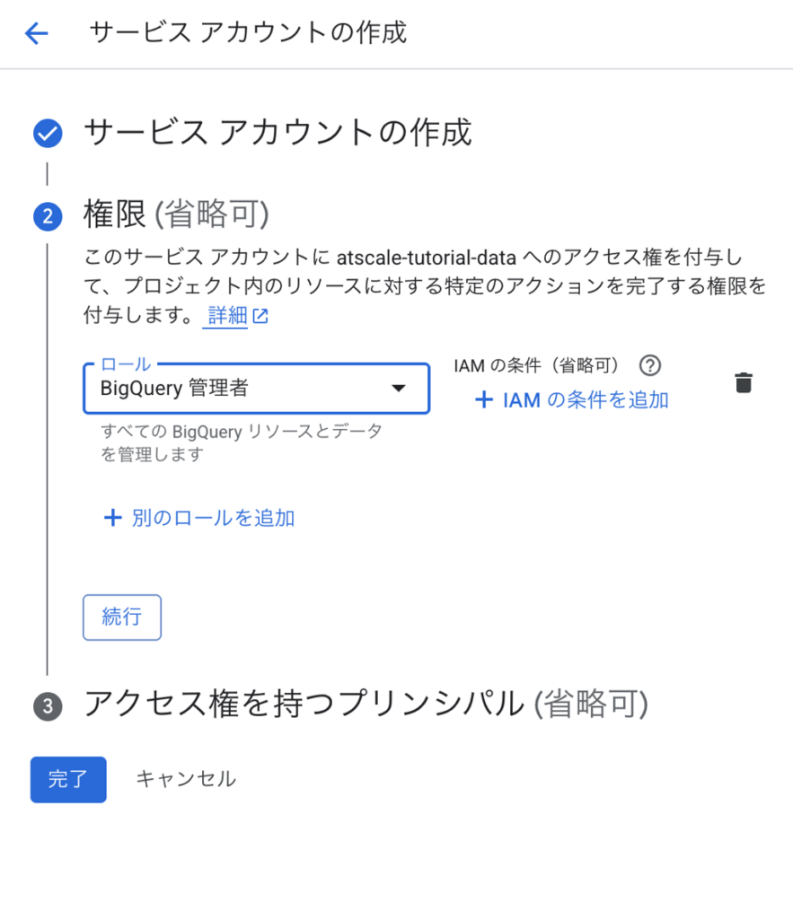 AtScaleが使用するサービスアカウントを作成して、BigQuery Adminロールを付与しておきます。