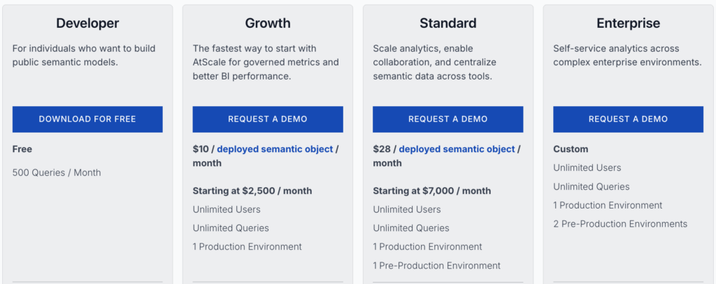 AtScale Developer Editionは完全無料で利用でき、エンタープライズ版と同じコア機能を使えるため、概念実証(PoC)や学習目的、小規模なチームでの利用に最適です。