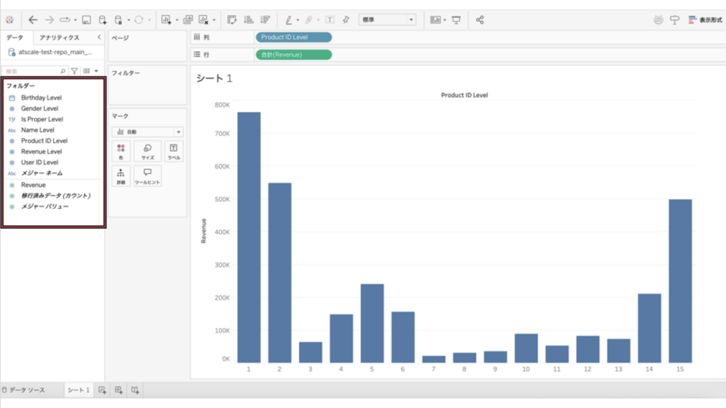 Tableauのダッシュボード画面を確認して、AtScaleのモデルで定義したメトリクスやディメンションがフィールドとして表示されていれば完了です!