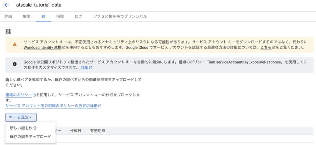 サービスアカウントのキーを作成して、JSONファイルとしてダウンロードします。