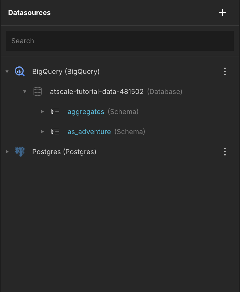 いくつかTutorial Modelが用意されていますが、これらはAtScaleが内部に保持しているDBに接続しています。